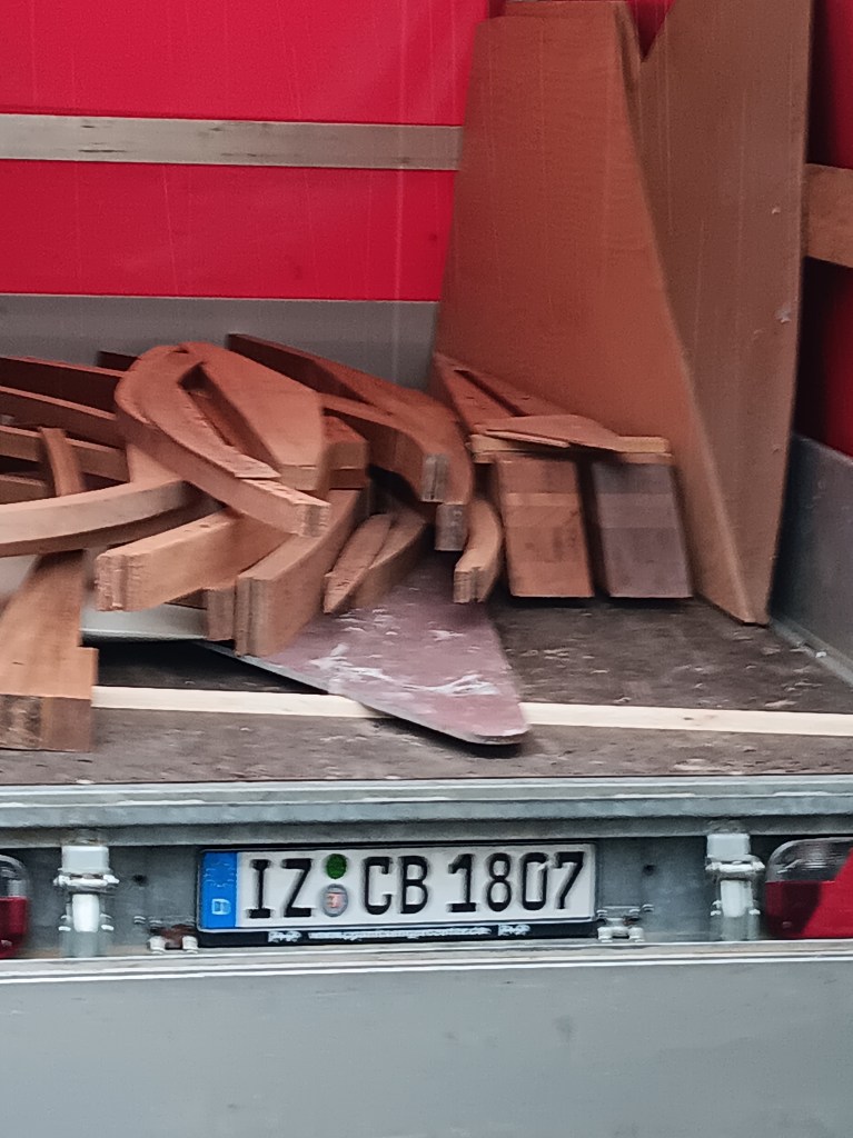 In der Anzeige, die uns auf Booti aufmerksam machte, war genau bechrieben, was alles im Lieferumfang enthalten war. Das war schon beeindruckend. Die ganzen Teile aber in der Realität zu sehen, sie in den eigenen Anhänger zu verladen und mit nach Hause zu nehmen, das war noch einmal so beeindruckend. Für mich um so mehr, als mir mal wieder viele Begriffe in der Anzeige nichts sagten. Ich spreche halt nur wenig „Bootisch.“Der Umgang mit Booten und deren Bau hat sooo… viele Begriffe, die mir bis zu meinem ersten Kontakt mit dem Segelboot meiner Schwiegereltern nichts sagten, dass ich das Gefühl hatte, das es sich hier um eine eigene Sprache handelt. Diese Sprache habe ich in diesem Blog bzw. der homepage Bootisch genannt. Ich bin gespannt darauf, wo die Teile in den nächsten Jahren ihren Platz im Boot finden werden.
