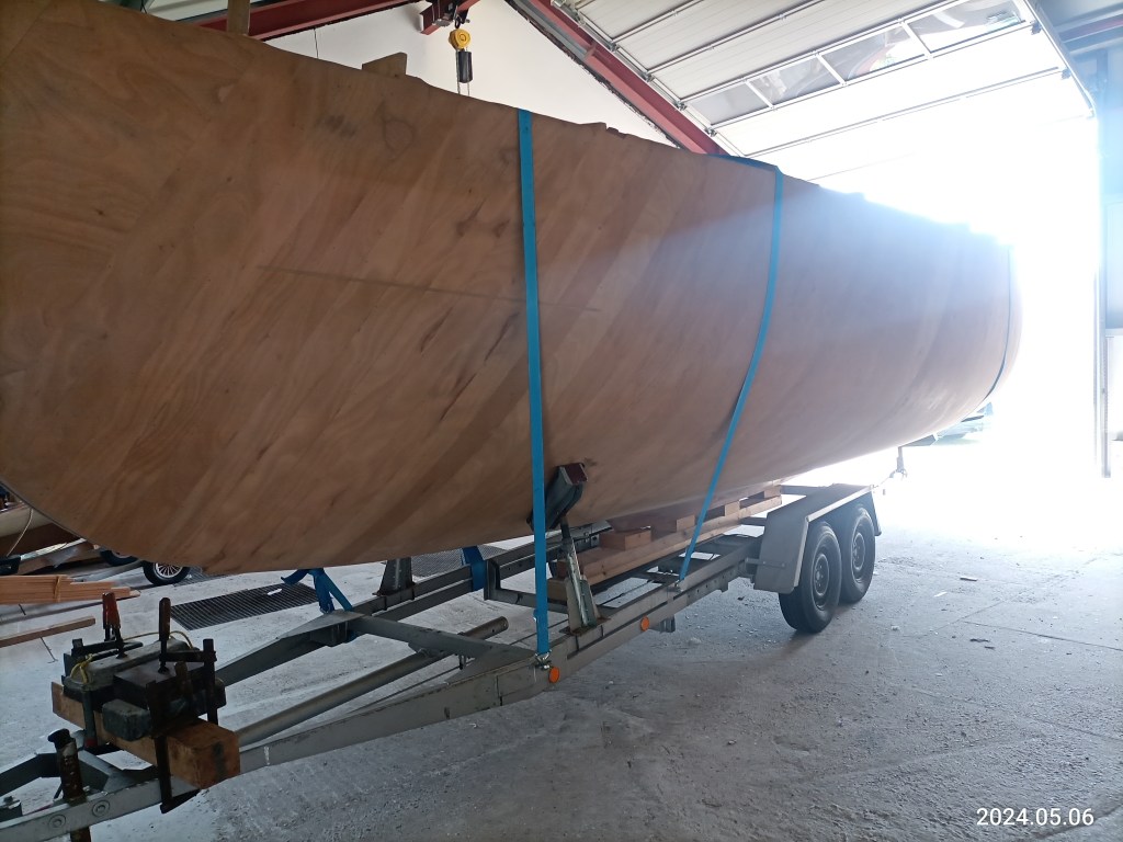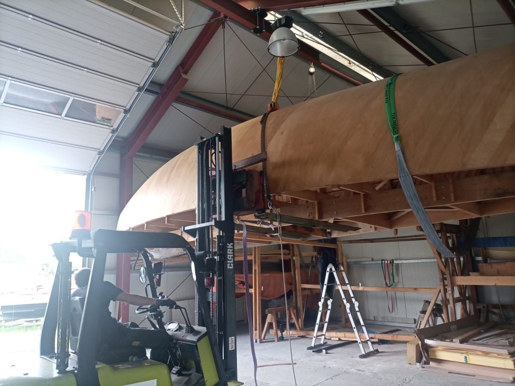 Bootis Verladung beginnt: Aus dem Regal, in dem der Rumpf in der Halle bei der Bootswerft Hein kopfüber lag , wurde er zunächst mit einem Gabelstapler herausgehoben und dann umgedreht, mit Hilfe von Spanngurten auf unserem Bootstrailer festgezurrt und so für den Transport am folgenden Tag vorbereitet.