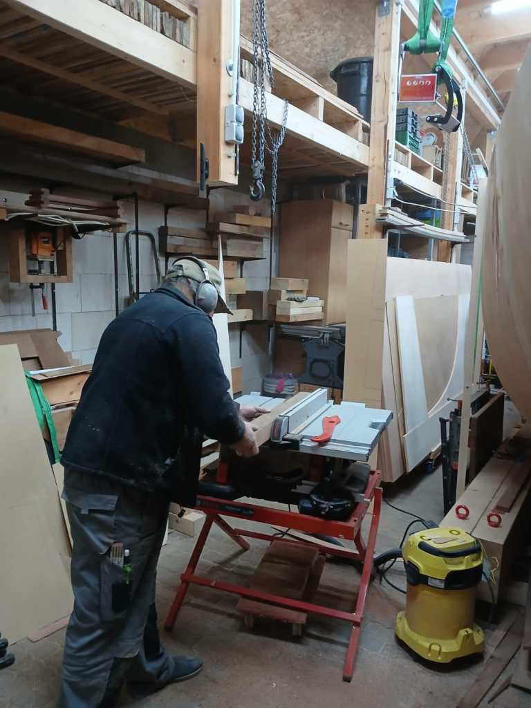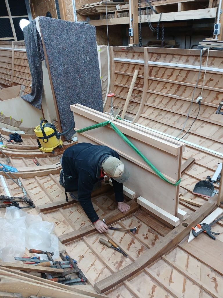 Der Schwertkasten wurde aus zwei Platten zusammengesetzt. Dann erfolgte die Anprobe. Mit dem Deckenkran schwebte der Kasten immer wieder ins Boot, bis er schließlich richtig eingepasst war.
