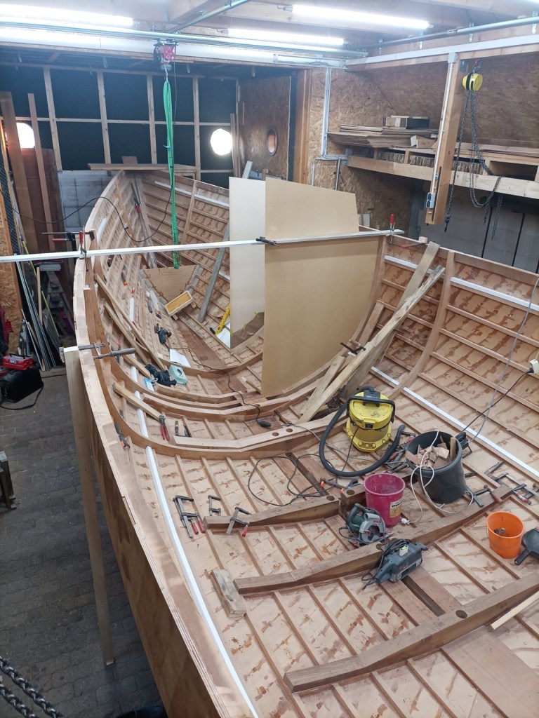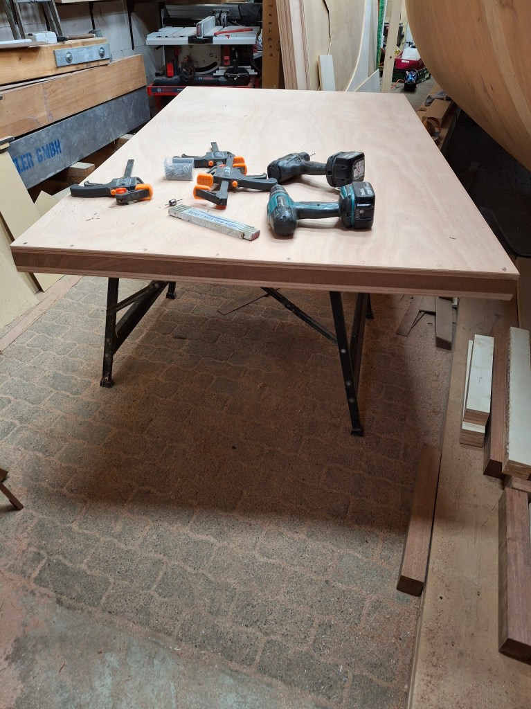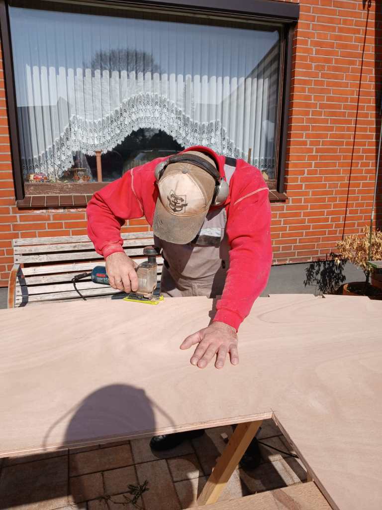 Mit dieser Schottwand mussten wir sogar auf die Terrasse ausweichen, da es in der Halle nicht genug PLatz gab. Zunächst wurde genau ausgemessen, wo die Wand ausgeschnitten werden musste, um sie zwischen die Bodenwrangen und die Längsspanten einzupassen. Dies wurde dann genau auf der Sperrholplatte aufgemalt und schließlich sorgfältig mit der Stichsäge ausgesägt. Nachdem alles ausgesägt wurde, erfolgte die Anprobe in dem Rumpf. Danach wurden noch einige Korrekturen vorgenommen. Doch schließlich konnte auch diese Wand einlaminiert werden.