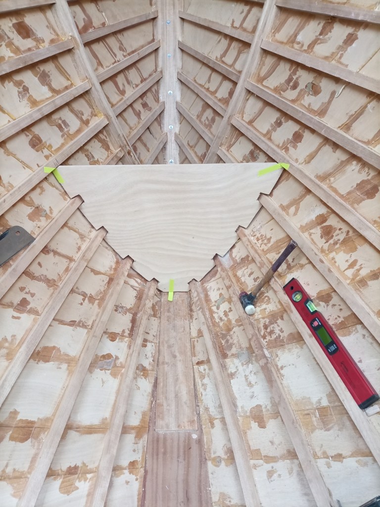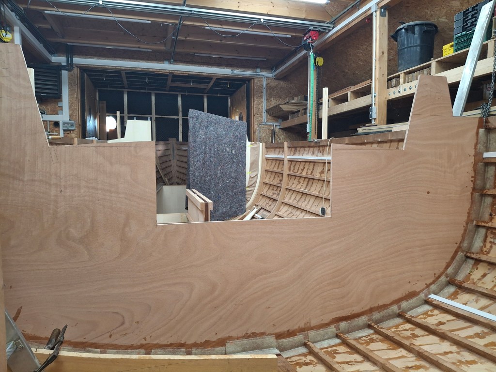 Die ersten beiden Sperrholzplatten für das spätere WC sind zugeschnitten und montiert. Die Platten wurden mit Glasfasermatten, die in Epoxidharz getränkt, bzw. sorgfältig mit einem Pinsel mit Epoxidharz betupft wurden, eingeklebt. Nach der Fertigstellung wurde das WC sorgfältig mit Decken abgehängt, damit beim weiteren Bau die Wände nicht beschädigt werden.
