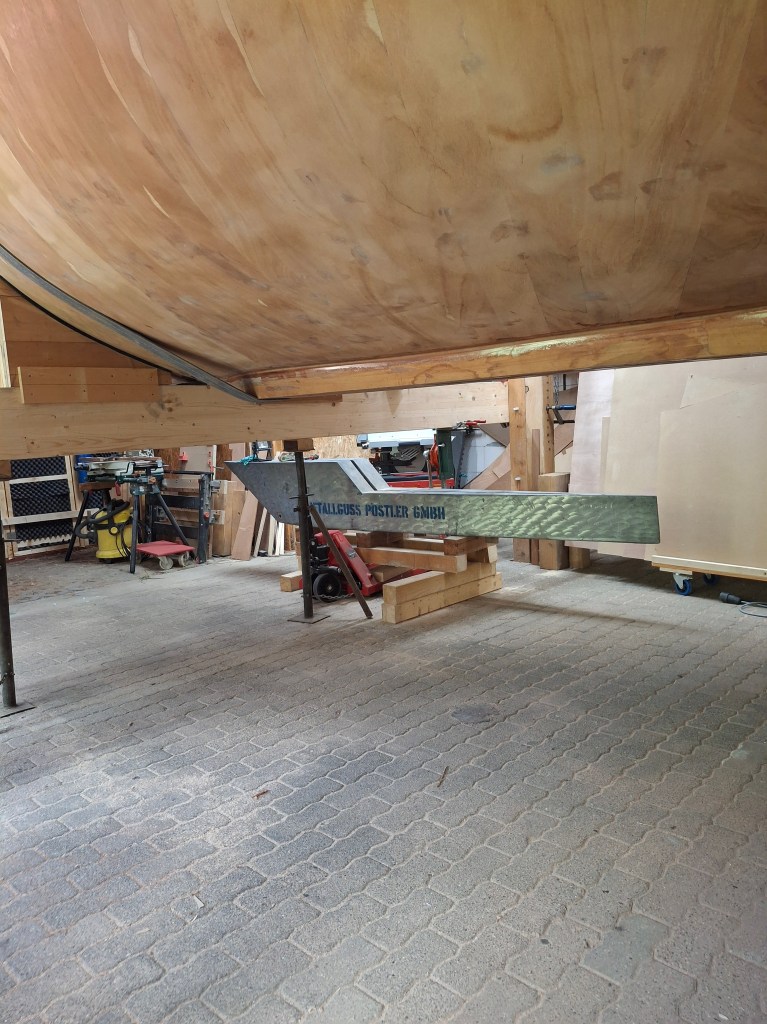 Nachdem er Kiel montiert war, haben wir das Pappmodell des Schwertes einmal probeweise eingesetzt, so dass wir uns schon einmal vorstellen konnten, wie Kiel und Schwert zusammen arbeiten werden. Leider gibt es davon keine Bilder.