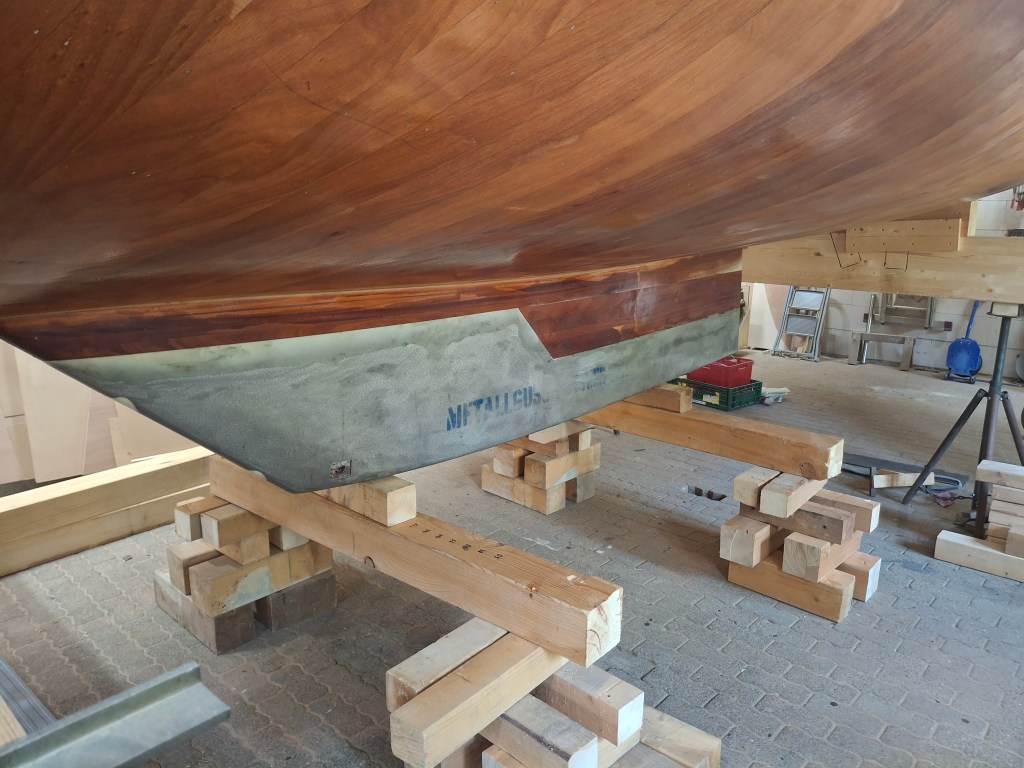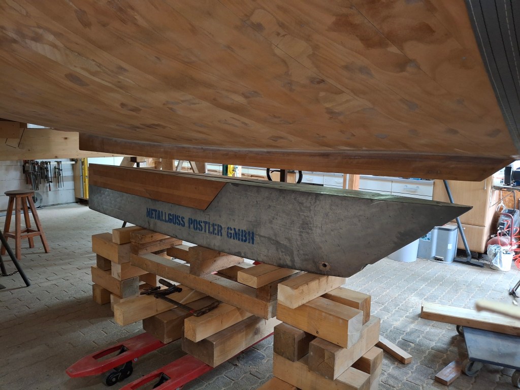 Nachdem der Kiel am Boot befestigt war, wurde er gespachtelt und geschliffen, um noch vorhandene große und kleine Unebenheiten auszugleichen.