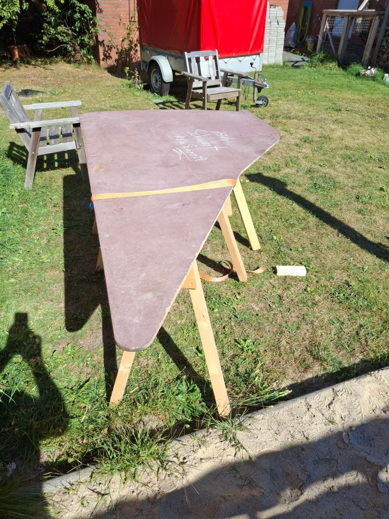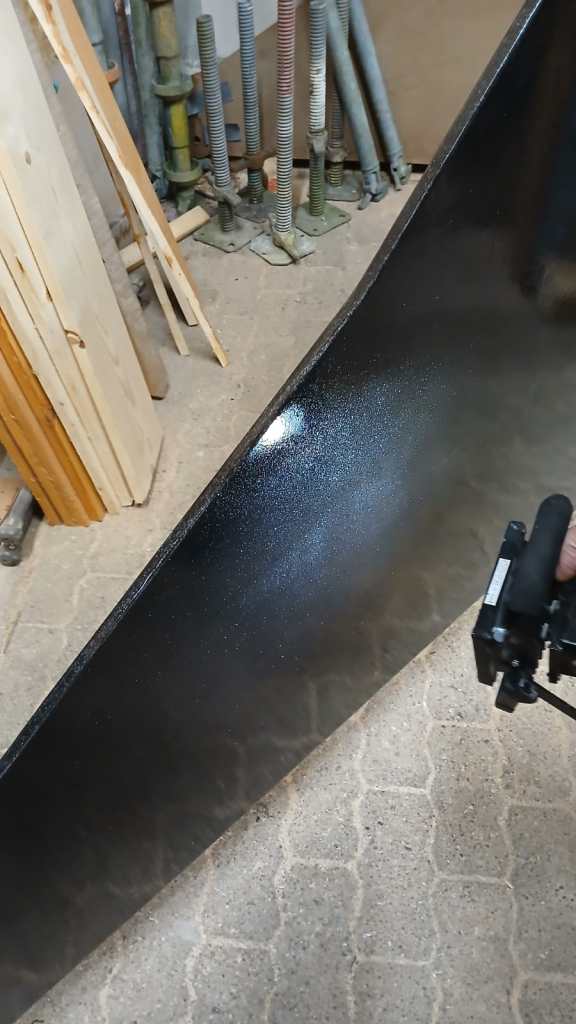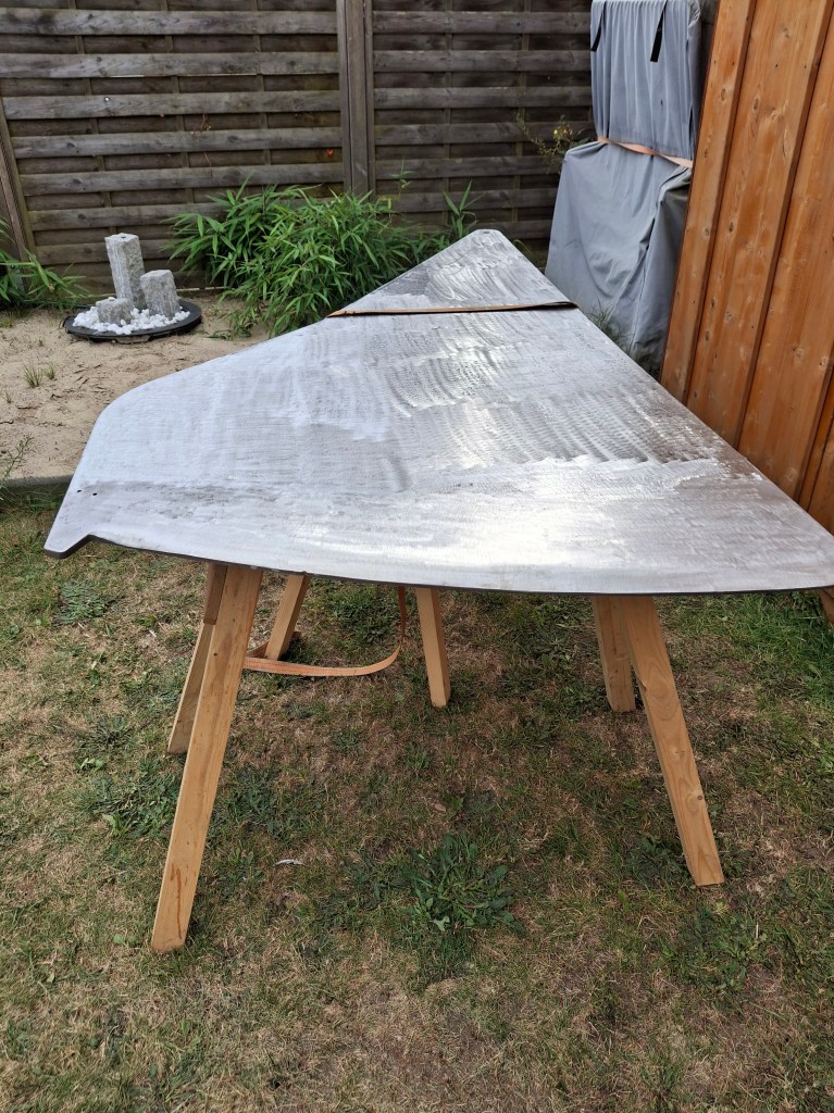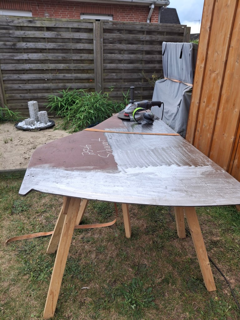 Mit Hilfe des Kettenzuges hat Bernd eine Konstruktion gebaut, mit der er das Schwert aus der Halle auf zwei Böcke legen konnte. Da das Schwert von der Werft mit einer Schutzschicht versehen war, musste es vor dem Anbau noch geschliffen werden. Dies dauerte einige Tage.