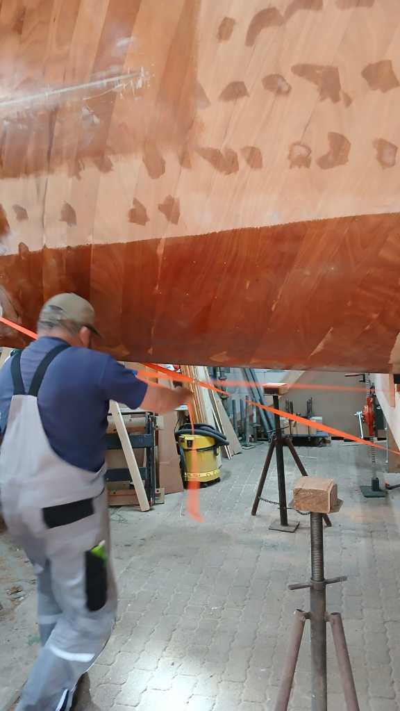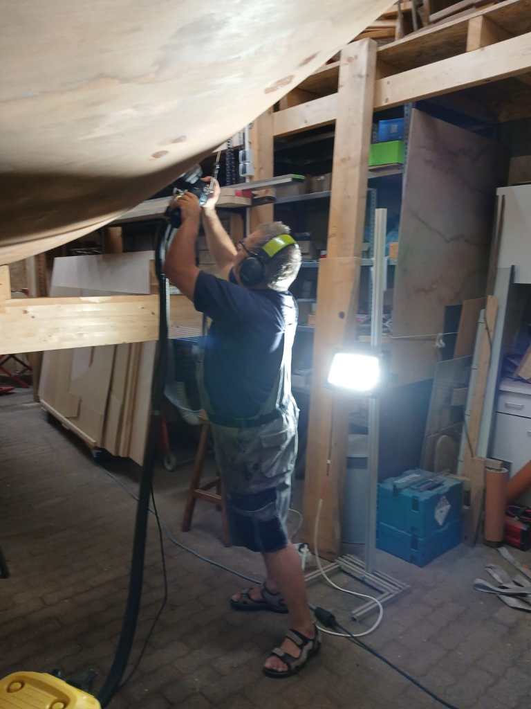 Nach dem Anstrich mit Epoxidharz wurde das unterwasserschiff noch einmal geschliffen, um letzte Unebenheiten zu entfernen.
