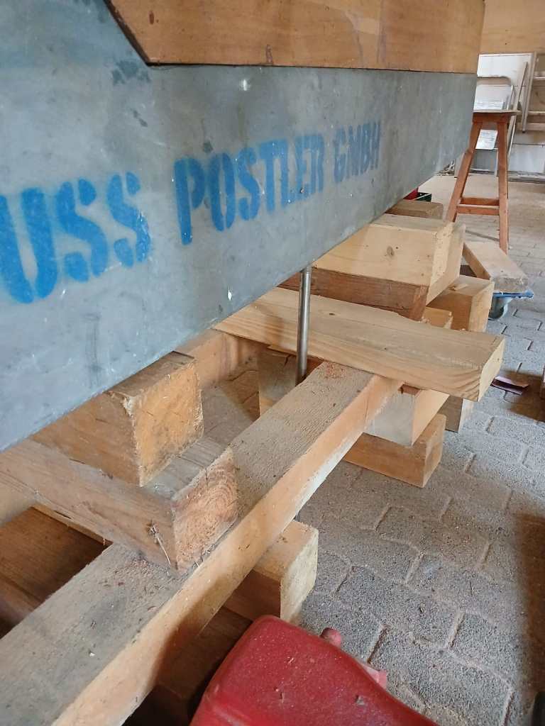 Mit Hilfe von Pallhölzern, die unter den Kiel geschoben wurden, wurde er Stück für Stück hochgehoben bis die richtige Höhe erreicht war.