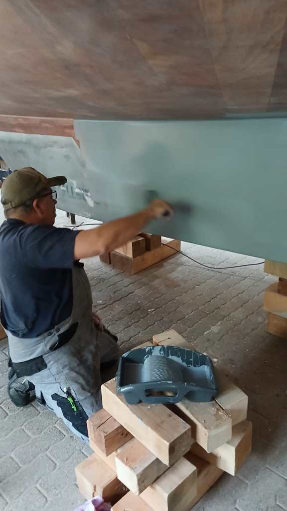 Unser Unterwasseranstrich wurde im letzten Schritt damit vervollständigt, dass das Schwert, das Ruderblatt und der Kiel einen letzten Anstrich mit dem sogenannten Top Coat bekamen.